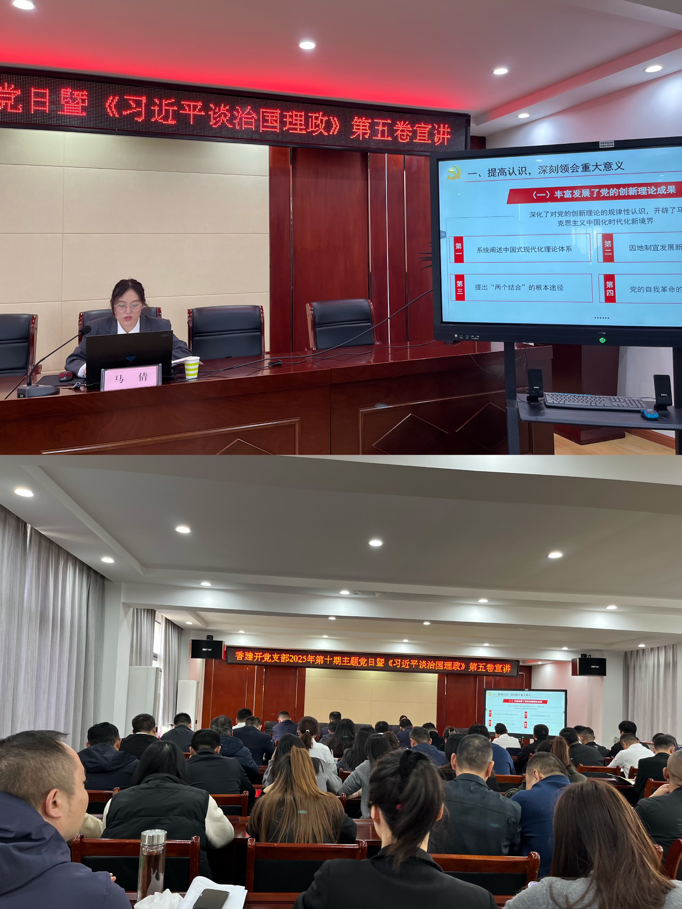 2025年10月24日,香建开公司党支部组织全体干部职工开展第十期主题党日活动,集中学习习近平总书记相关讲话精神和近期重要讲话文章、指示、贺信,持续巩固拓展学习教育成果,及时跟进学习典型问题通报,建立健全常态化“回头看”机制,加强总结复盘,推进作风建设从集中整治向常态长效转变。