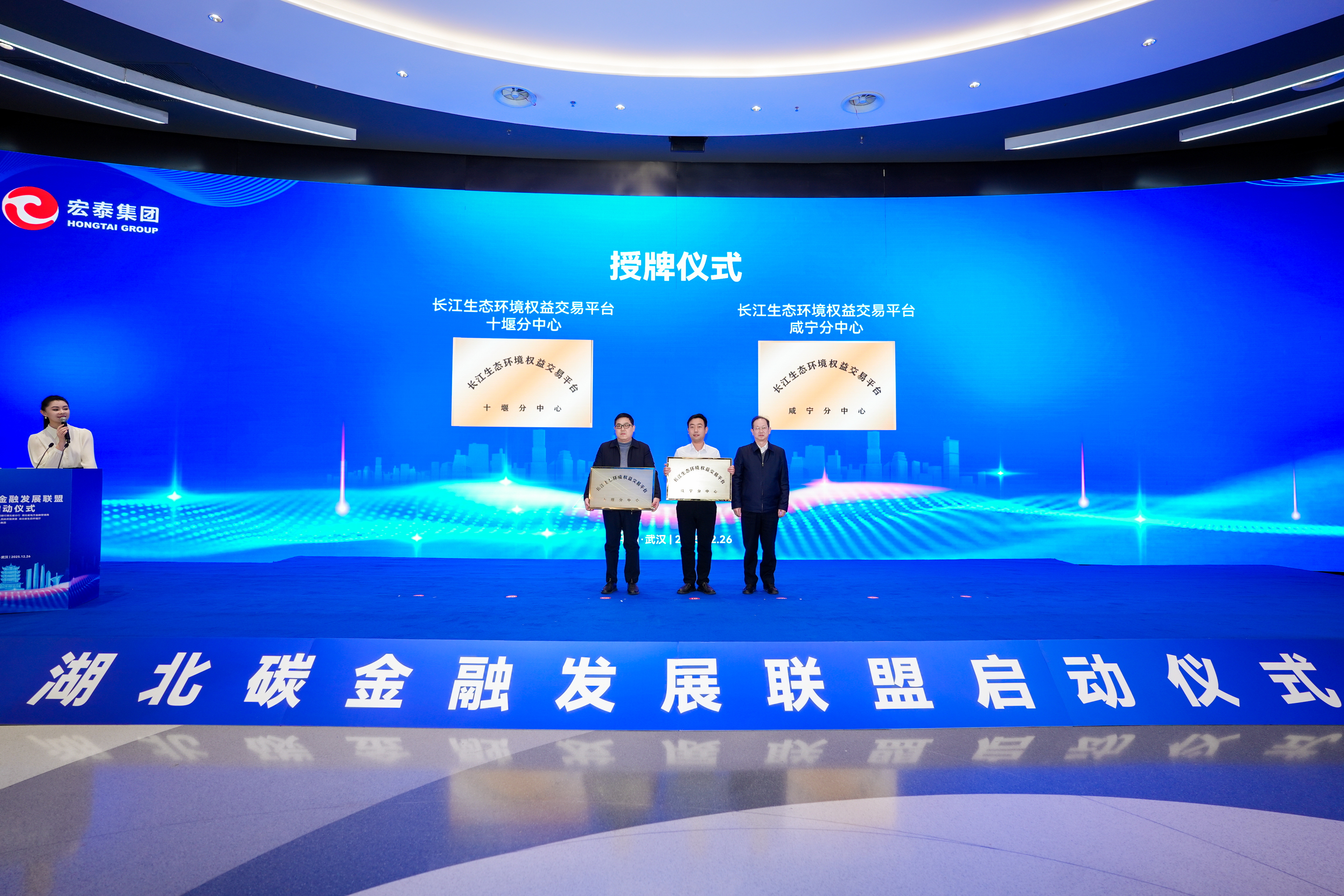 12月26日上午,在湖北省国资委、省地方金融管理局、中国人民银行湖北省分行及省生态环境厅的联合指导与推动下,由湖北宏泰集团牵头组建的“湖北碳金融发展联盟”正式宣告成立。成立大会上,省生态环境厅二级巡视员田啟代表联盟及省级平台,向咸宁城发集团旗下绿色产业发展投资有限公司授予“长江生态环境权益交易平台咸宁分中心”牌匾,绿产公司总经理吴成代表公司接受授牌。