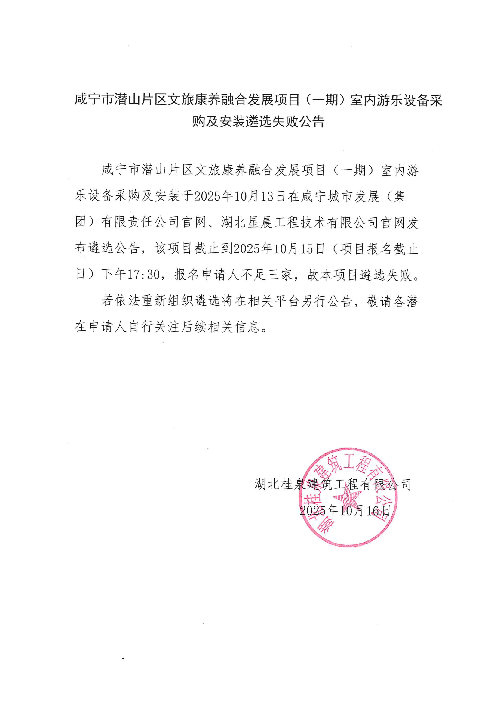 咸宁市潜山片区文旅康养融合发展项目(一期)室内游乐设备采购及安装遴选失败公告