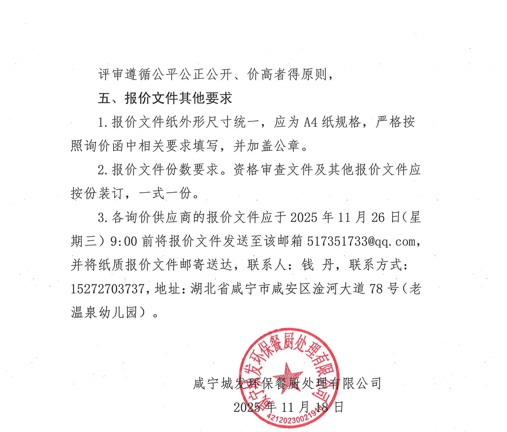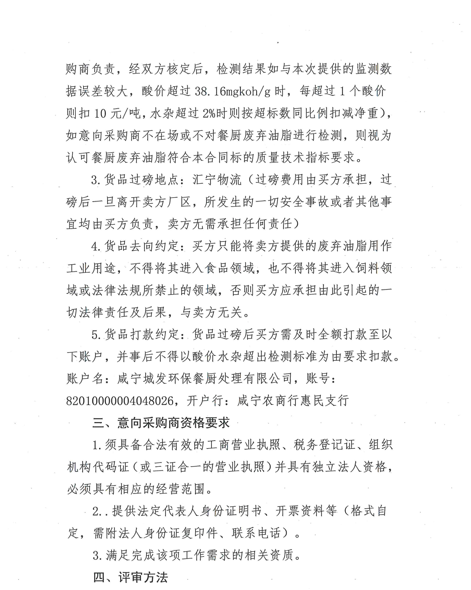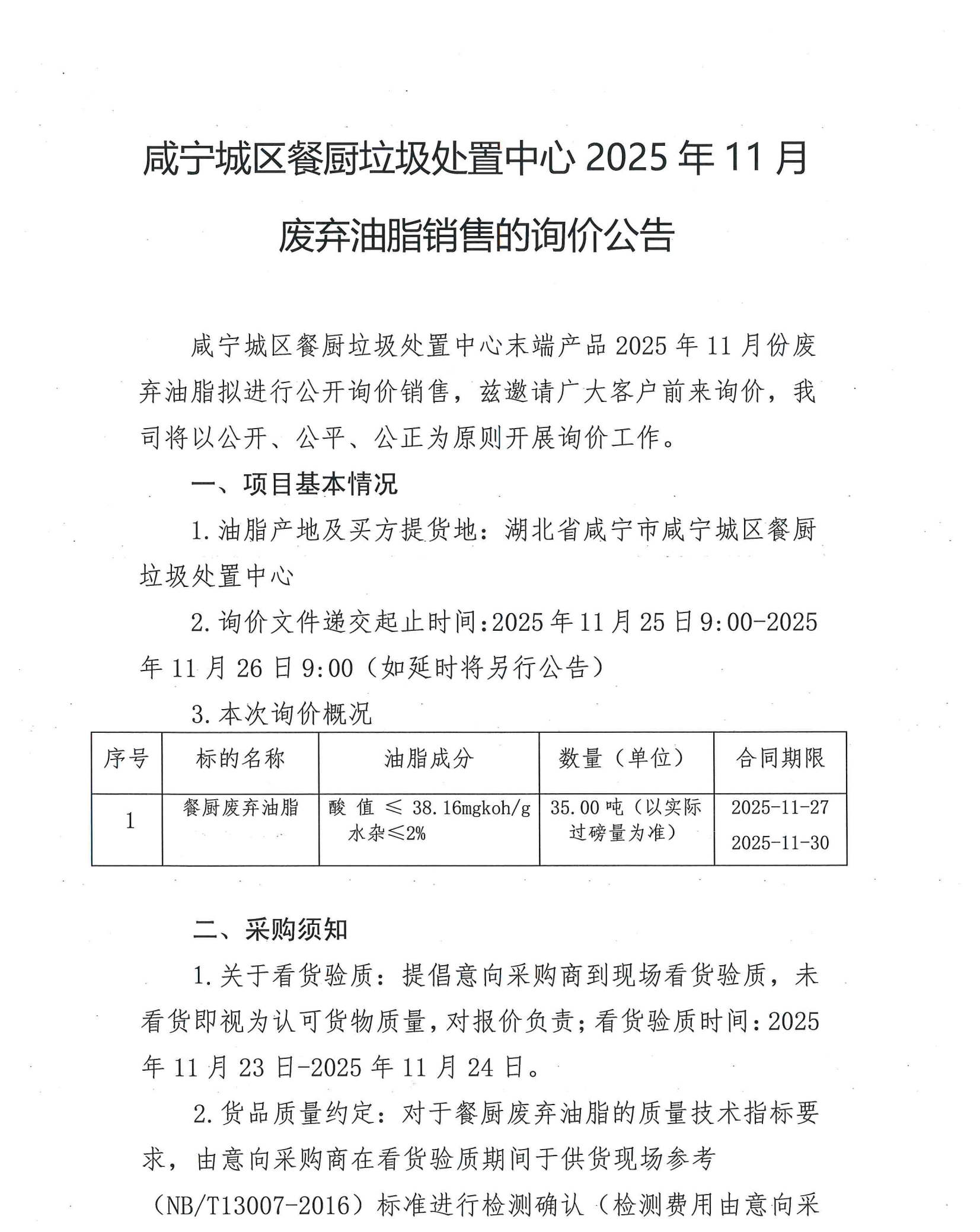 咸宁城区餐厨垃圾处置中心2025年11月废弃油脂销售的询价公告