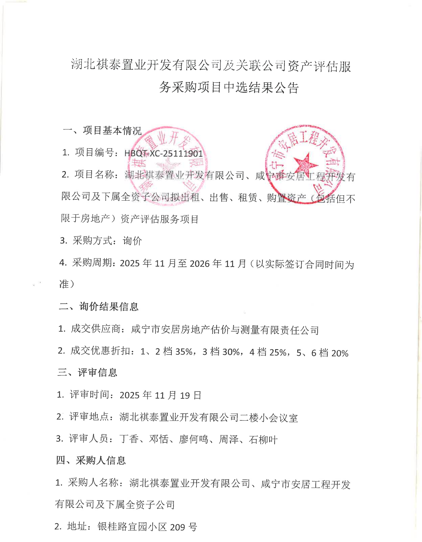 湖北祺泰置业开发有限公司及关联公司资产评估服务采购项目中选结果公告