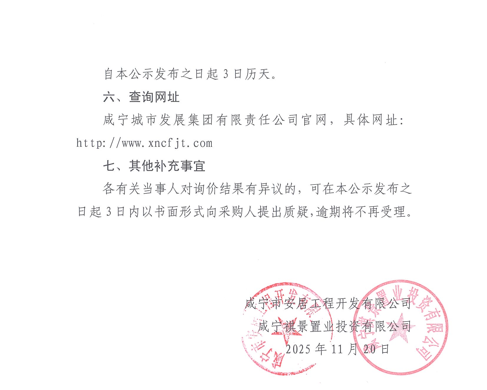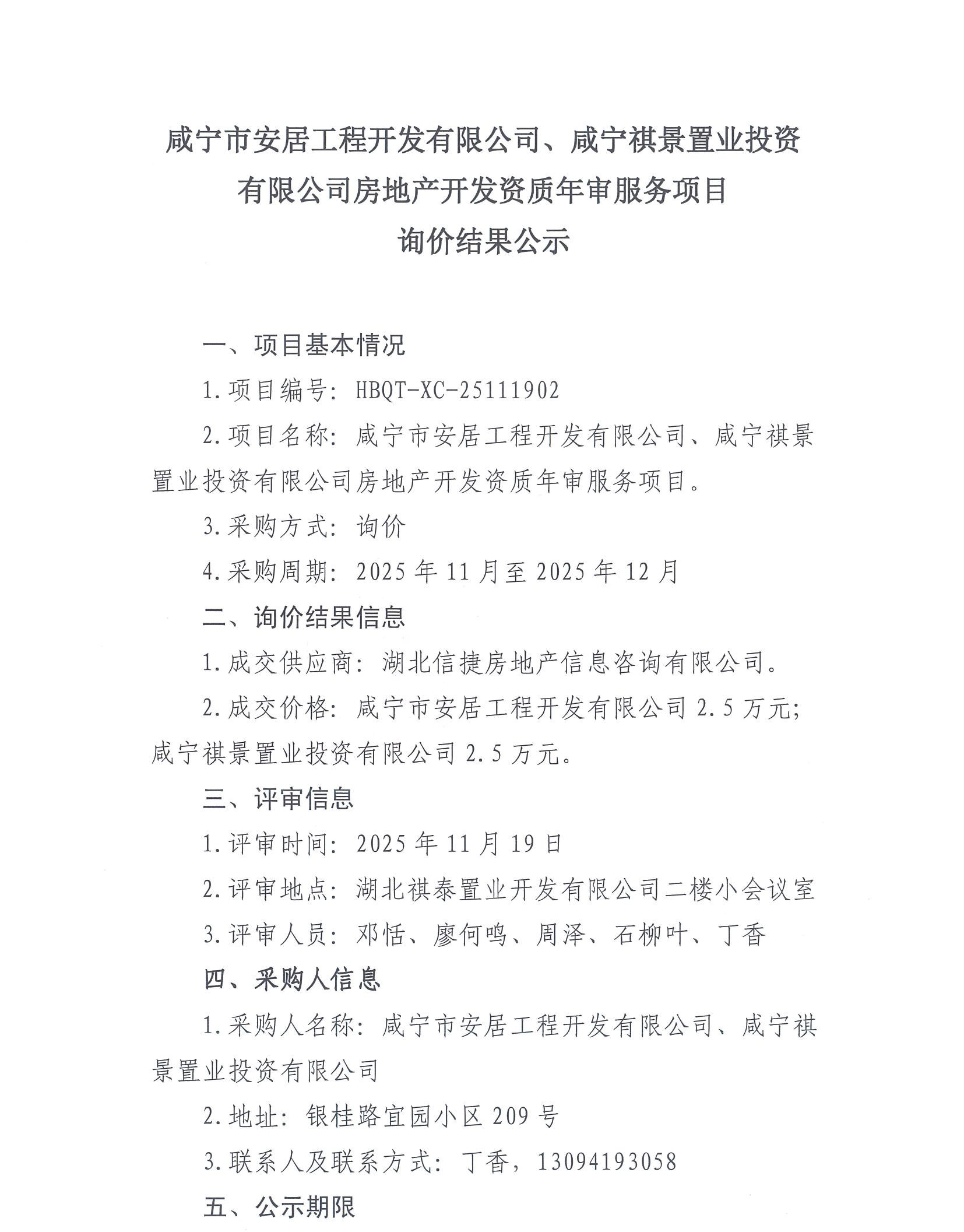 咸宁市安居工程开发有限公司、咸宁祺景置业投资有限公司房地产开发资质年审服务项目询价结果公示