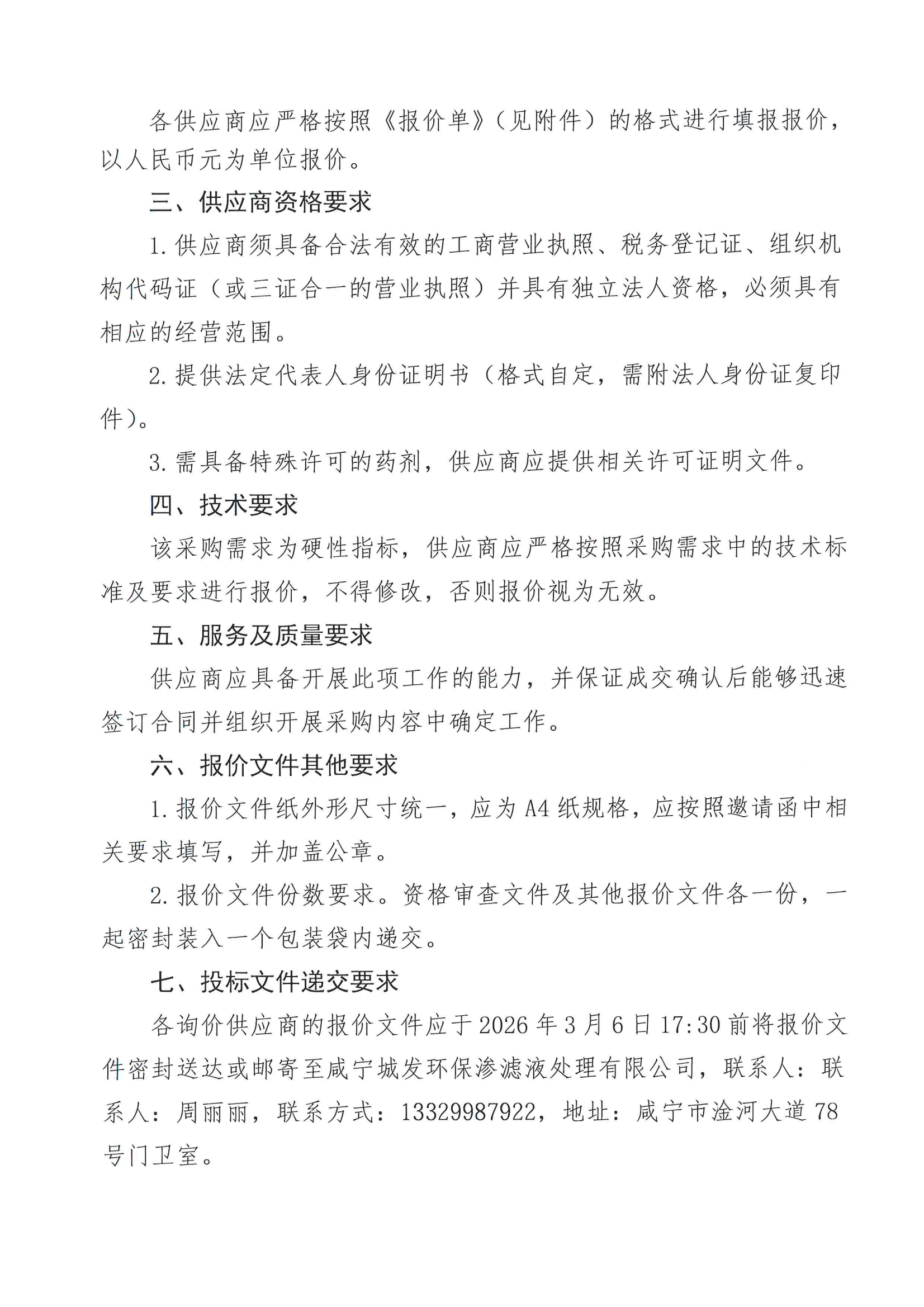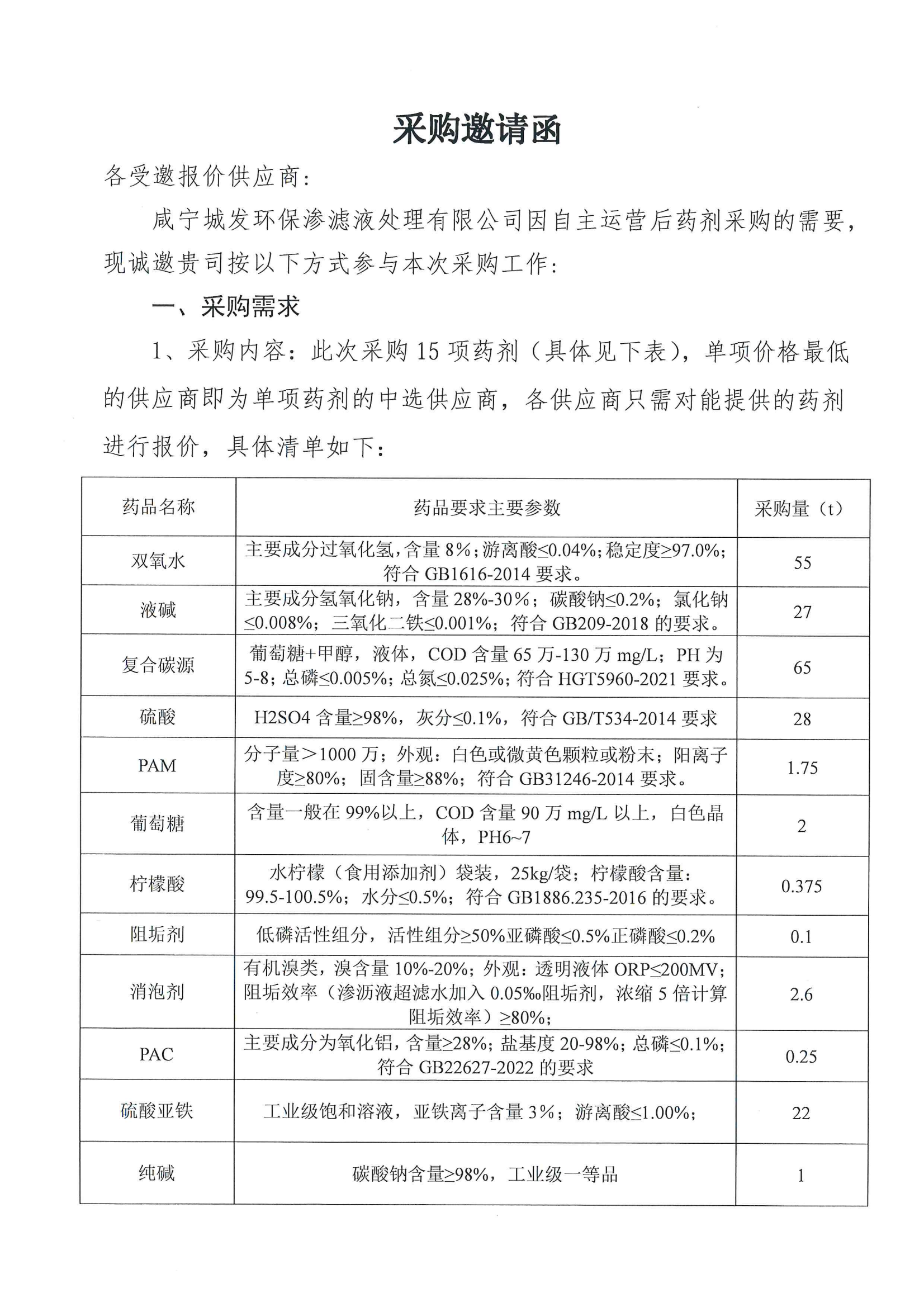 渗滤液项目采购2026年第二季度生产药剂采购方案及邀请函