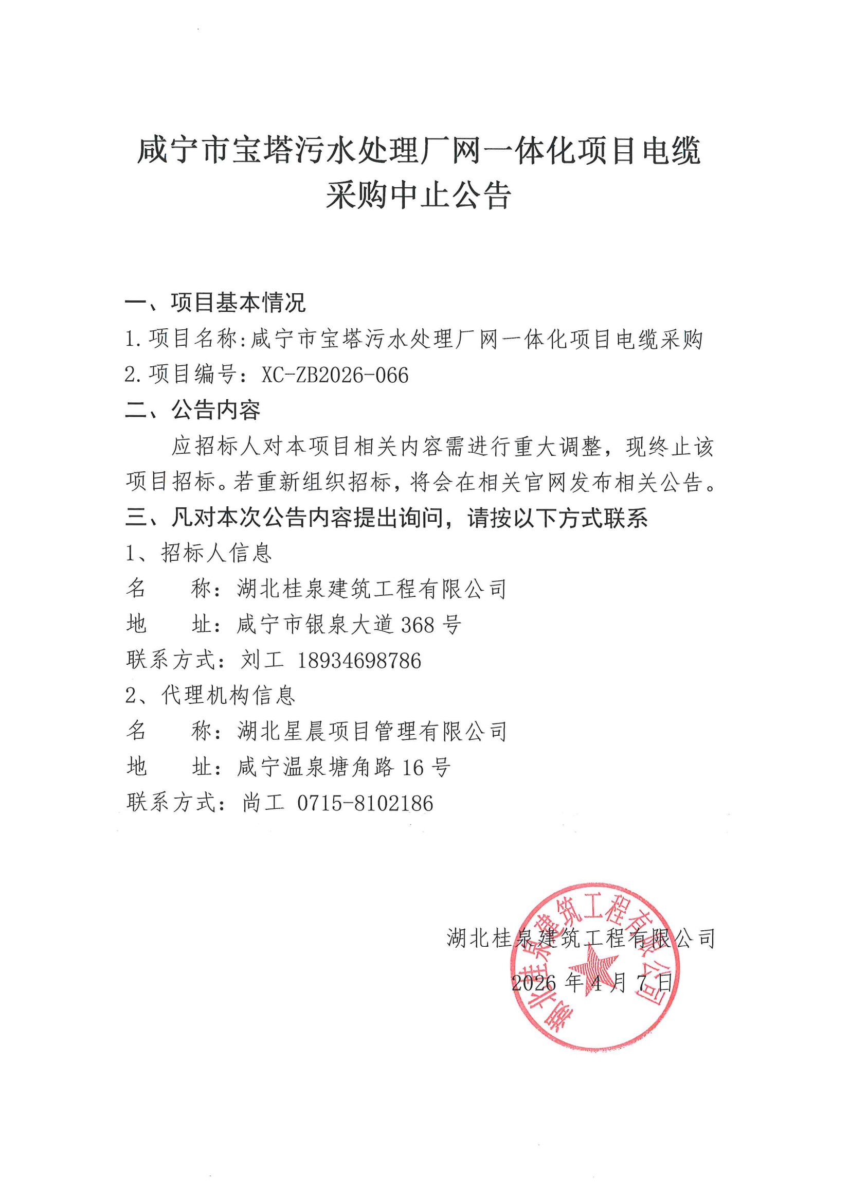 咸宁市宝塔污水处理厂网一体化项目电缆采购终止公告