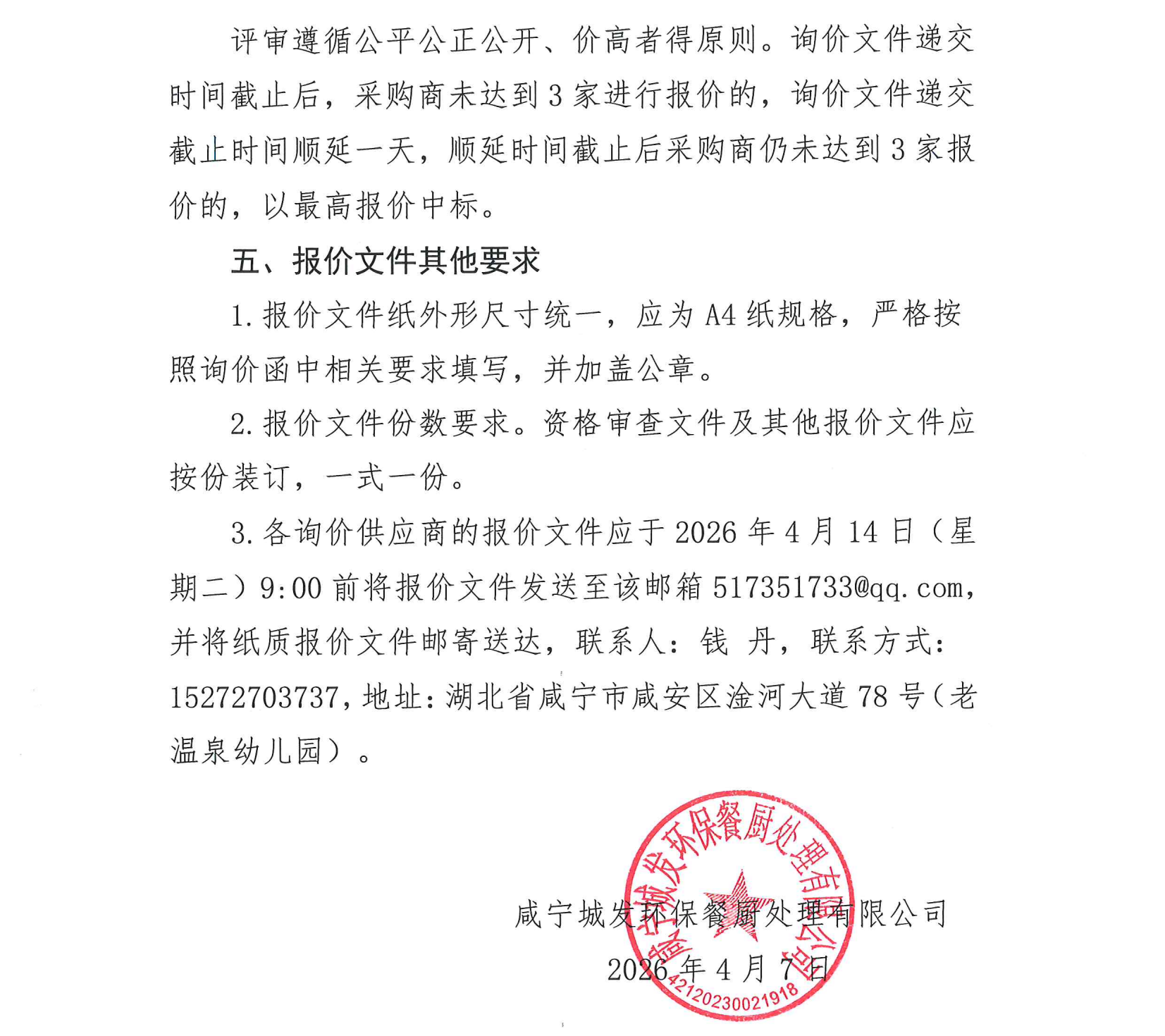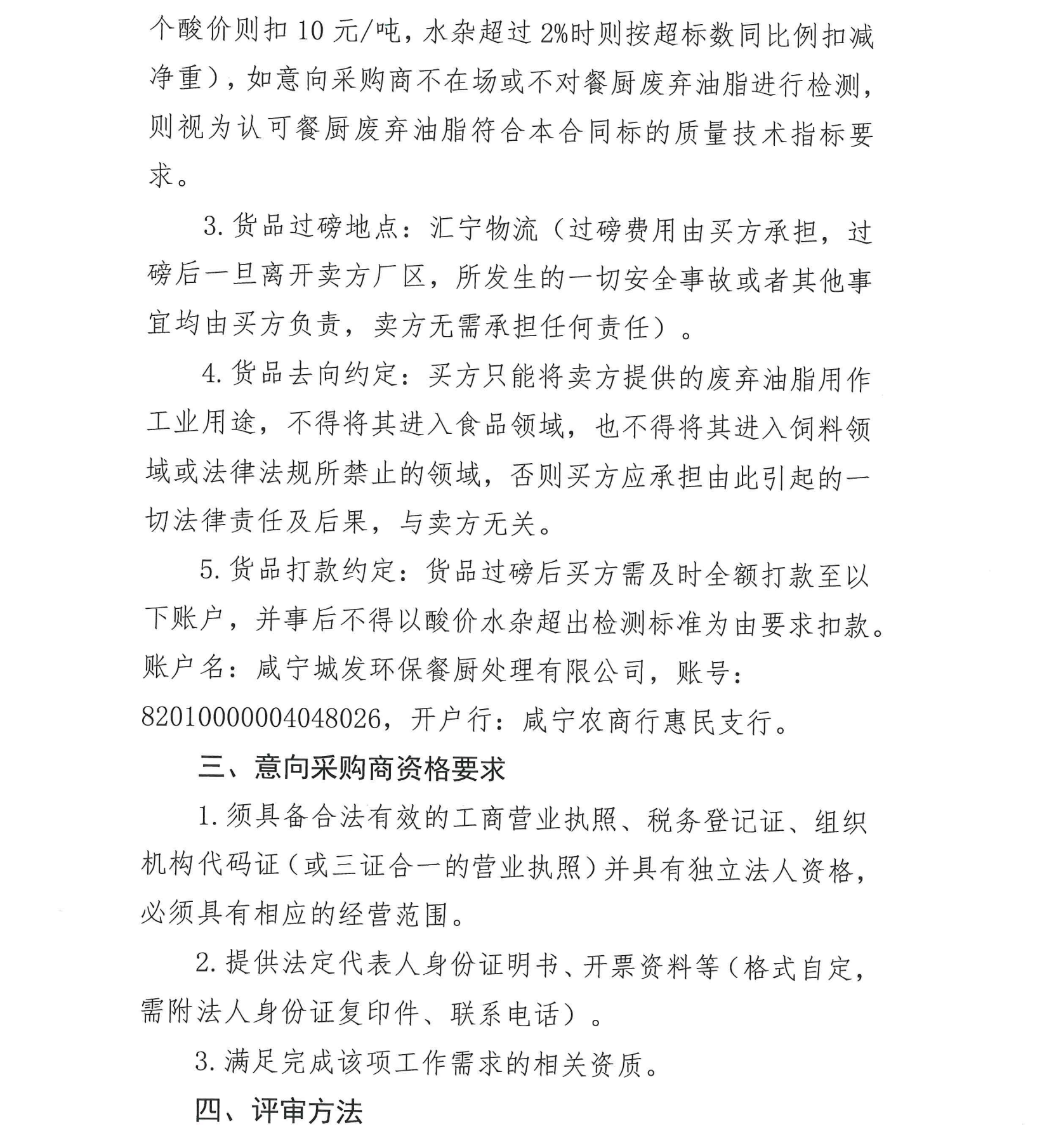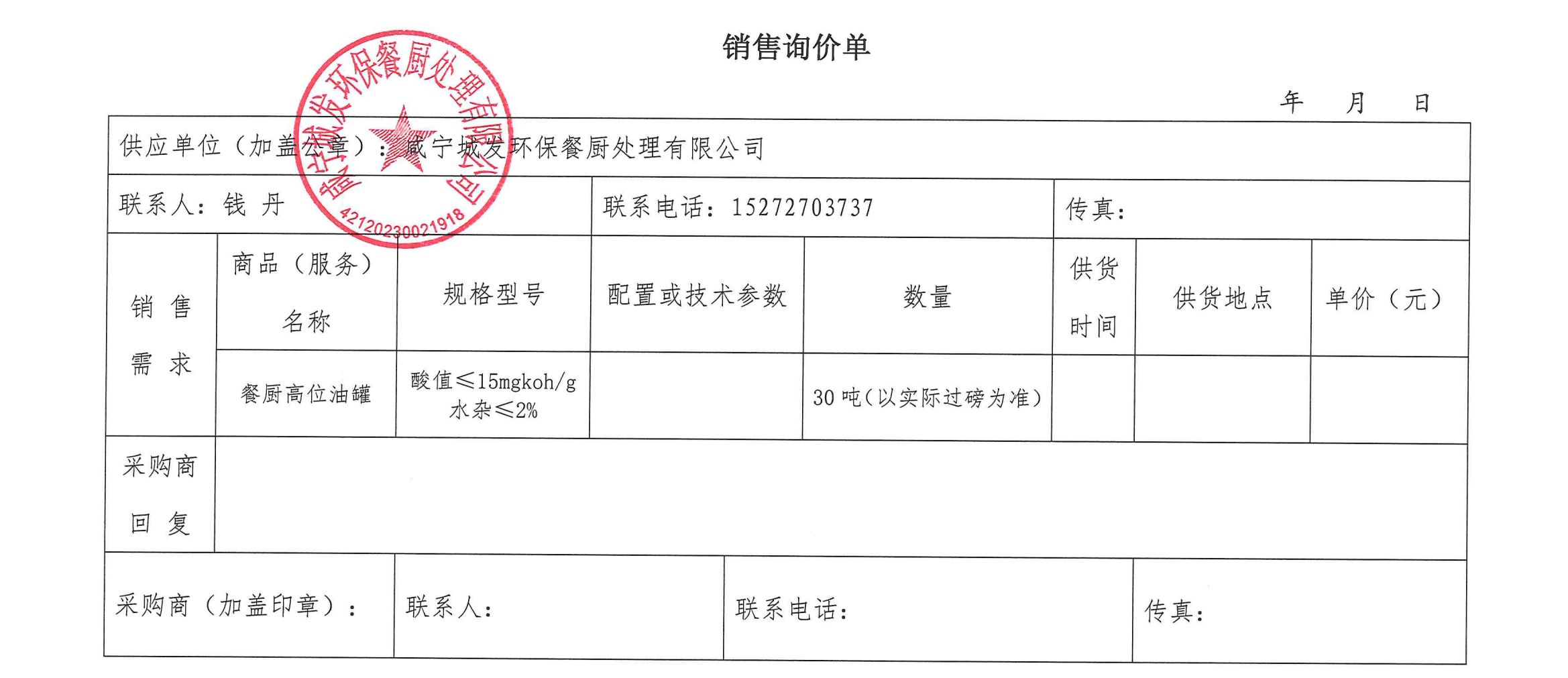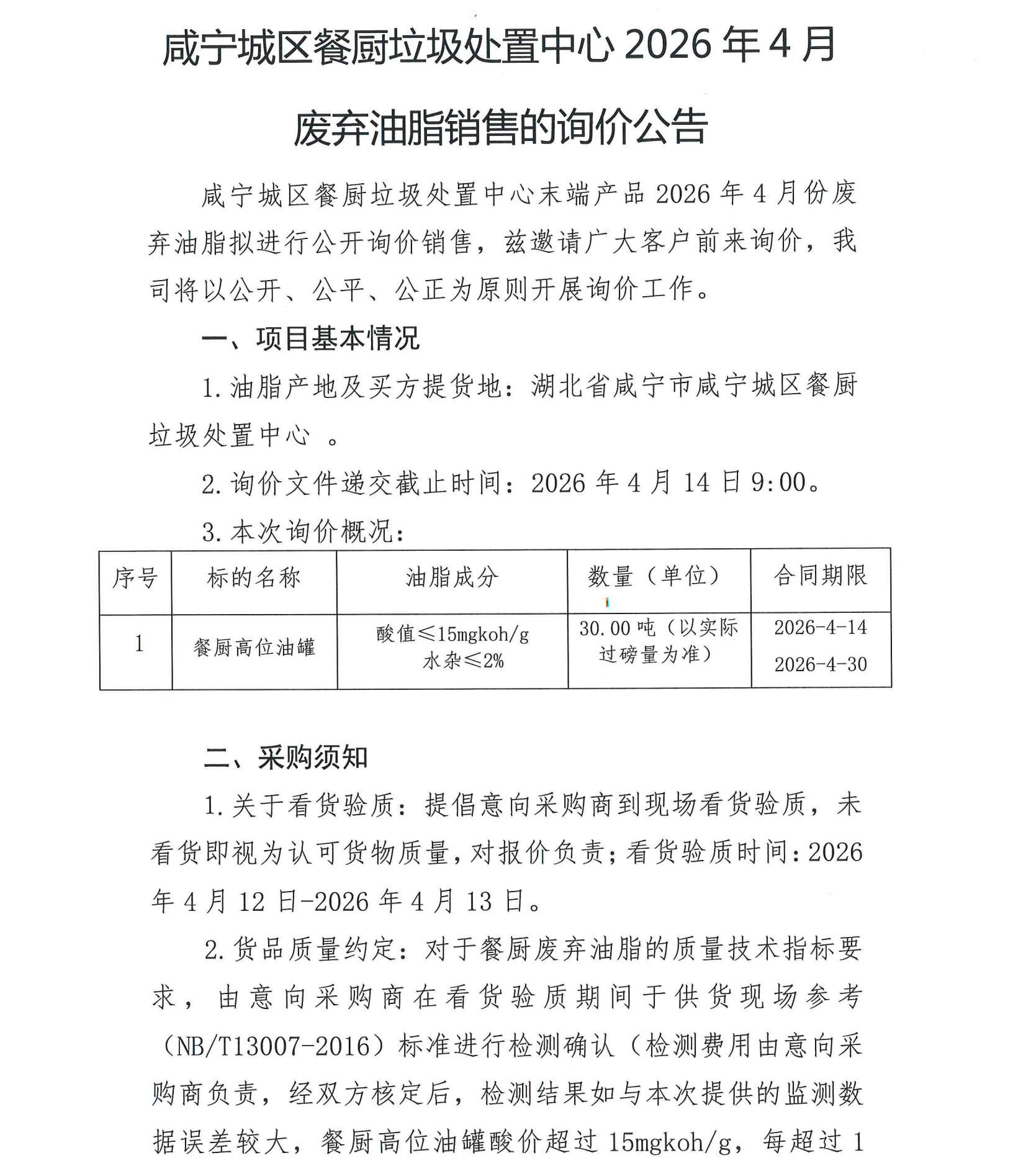 咸宁城区餐厨垃圾处置中心2026年4月废弃油脂销售的询价公告