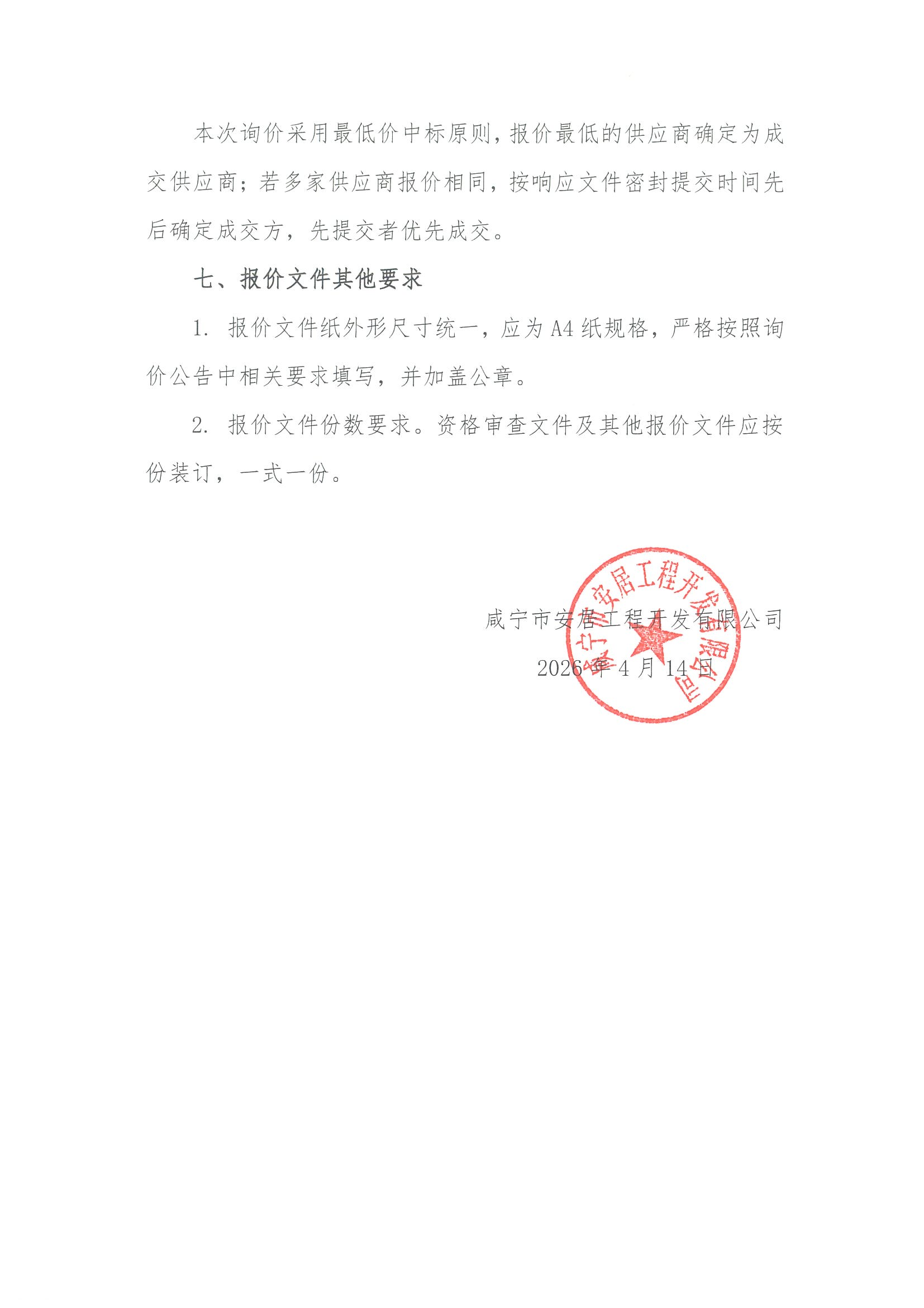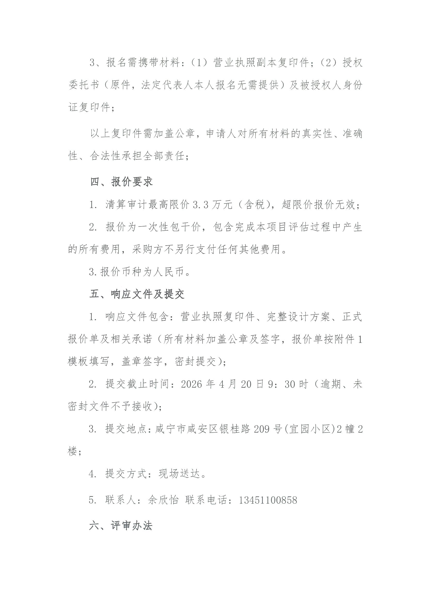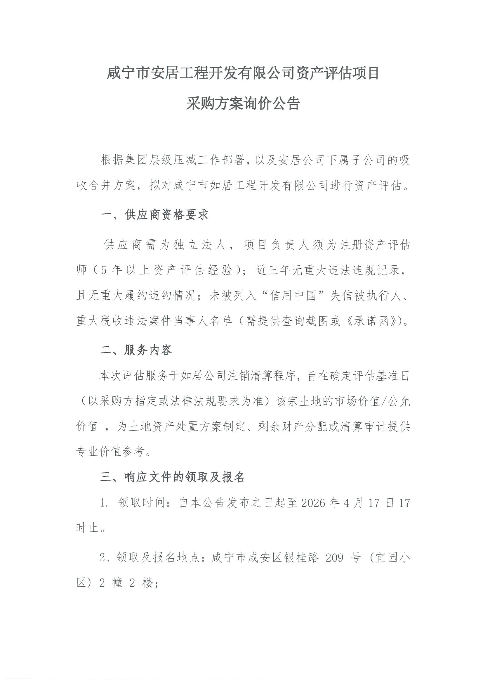 咸宁市安居工程开发有限公司资产评估项目采购方案询价公告