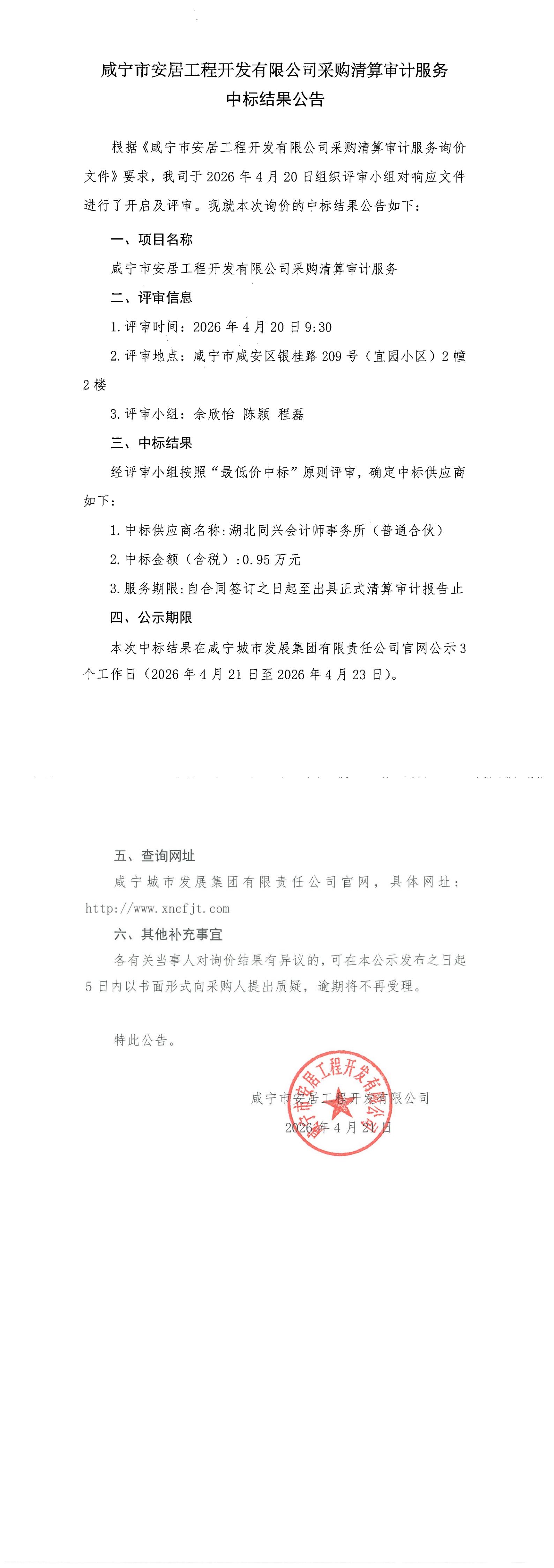 咸宁市安居工程开发有限公司采购清算审计服务中标结果公告