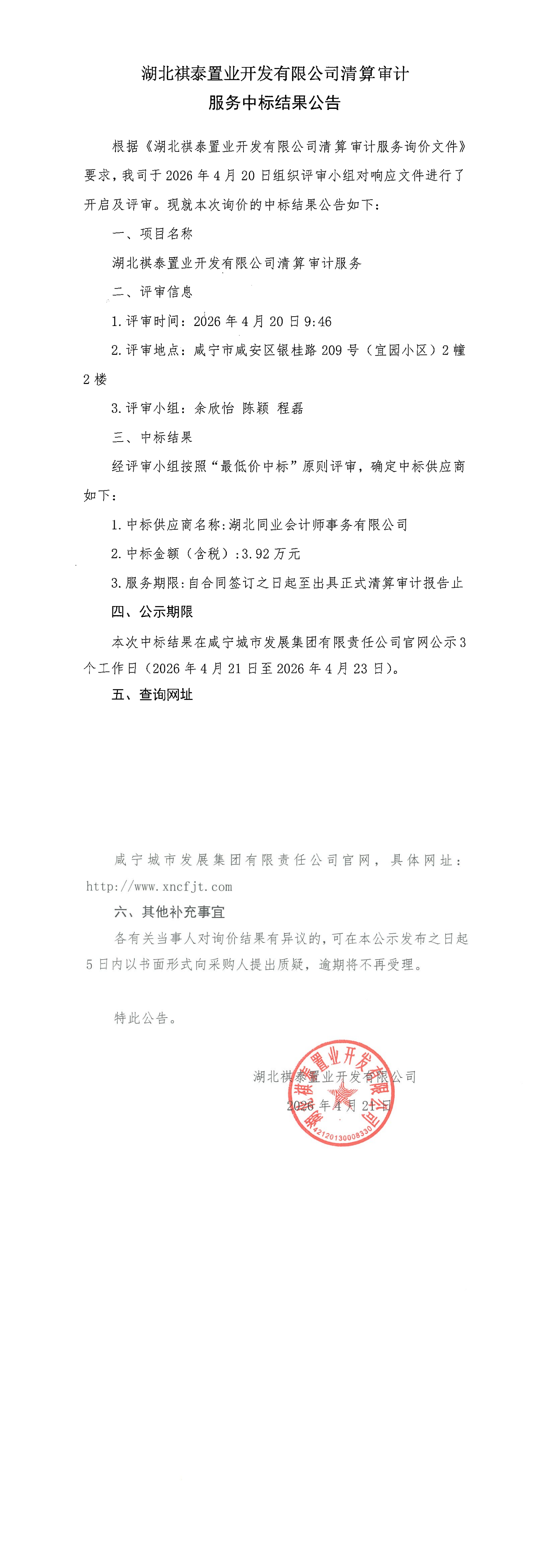 湖北祺泰置业开发有限公司清算审计服务中标结果公告